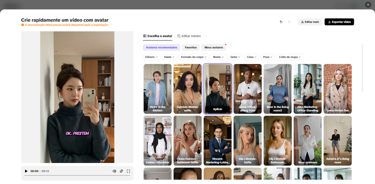 O Pippit permite criar vários vídeos de haul em lote, economizando horas de trabalho. É possível experimentar diferentes personalidades de avatares para descobrir qual estilo mais agrada ao público. Alguns podem atrair audiências mais jovens, enquanto outros podem conquistar um público mais profissional.