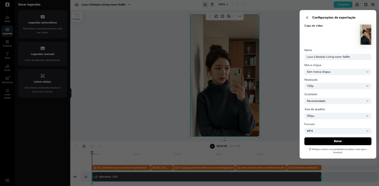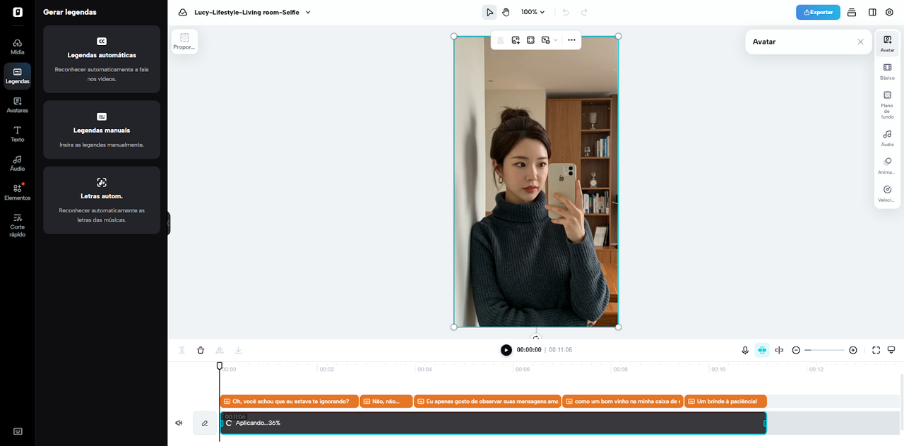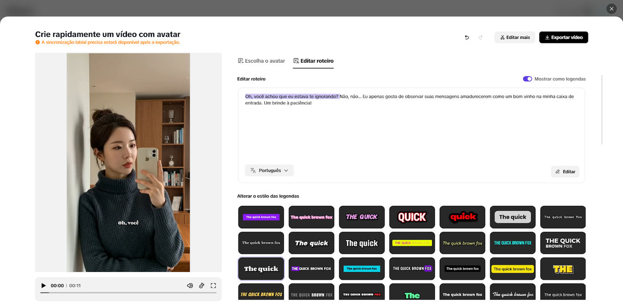 Depois de escolher, clique no botão “Editar roteiro” e digite algumas falas descrevendo cada produto. A ferramenta suporta diversos idiomas e o avatar faz a dublagem labial perfeitamente. Lembre-se de rolar até a seção “Alterar estilo das legendas” e selecionar um que dê mais destaque e estilo aos seus vídeos de haul.