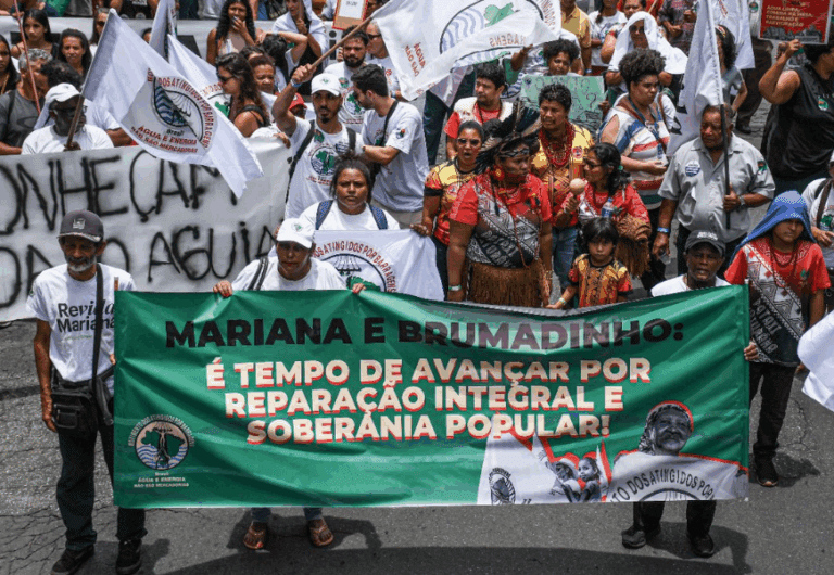 A tragédia-crime de Mariana, em 5 de novembro de 2015, despejou 39 milhões de metros cúbicos de rejeitos no Rio Doce, matou 19 pessoas, destruiu comunidades inteiras e contaminou a água que abastece centenas de municípios em Minas e no Espírito Santo, alterando drasticamente o modo de vida das pessoas. Problemas que vão além das questões socioambientais e econômicas, com impactos na saúde física e mental das famílias. Uma década depois, os atingidos seguem cobrando justiça, reparação integral e o fim da impunidade das mineradoras.