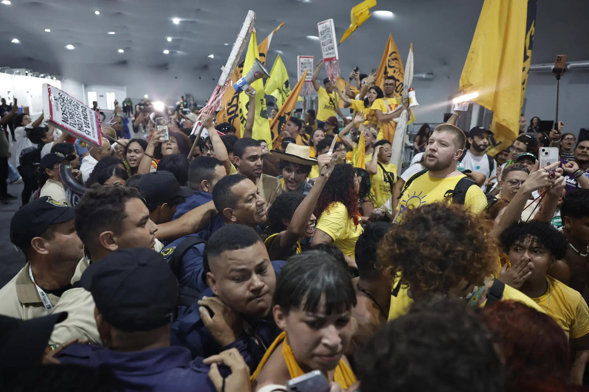 O grupo, que era composto por indígenas, manifestantes contrários à exploração de petróleo e estudantes, protestava contra a guerra de Israel contra o Hamas, com bandeiras da Palestina, e levava cartazes com palavras de ordem contra a exploração de petróleo no Amazonas. Aparelhos de raio-x foram quebrados.
