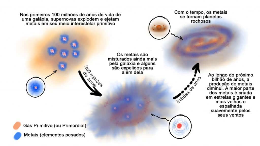 Quando as primeiras galáxias surgiram, o Universo era formado quase totalmente por hidrogênio e hélio. Os demais elementos surgiram dentro de estrelas antigas, que os espalharam pelo espaço quando explodiram como supernovas. Esse enriquecimento químico costuma levar centenas de milhões de anos, o que torna surpreendente encontrar galáxias tão jovens com tantos metais.