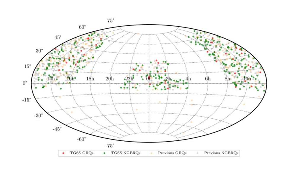 Distribuição em todo o céu dos quasares descobertos pela nova pesquisa, juntamente com os detectados anteriormente. Os pontos vermelhos e verdes representam os novos, e os pontos laranja e cinza correspondem aos já conhecidos. Crédito: Souvik Manik, Netai Bhukta, Sabyasachi Pal e Sushanta K. Mondal