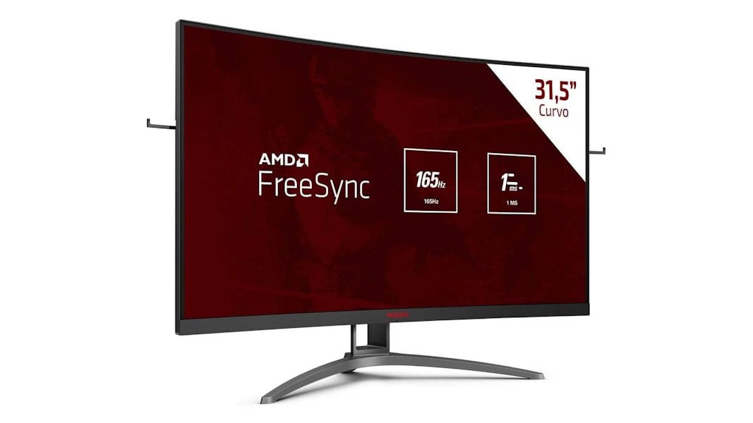 Para quem busca a melhor imagem possível, este monitor tem tela curva de 32 polegadas, taxa de atualização de 165 Hz e tempo de resposta de 1 ms. O painel é do tipo VA e traz suporte para FreeSync, o que reduz falhas na imagem durante jogos. A base é ajustável em altura e inclinação, e o design segue o estilo gamer, com bordas finas e iluminação discreta.