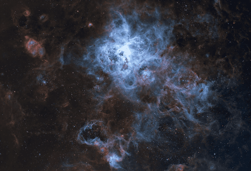 Já a segunda imagem mostra a complexa nebulosa da Tarântula ou NGC 2070, uma nuvem de gás incandescente de baixa densidade de plasma localizada na Grande Nuvem de Magalhães, a cerca de 160 mil anos luz de distância, na direção da Constelação do Peixe Dourado. Com um diâmetro de cerca de 650 anos-luz, a Nebulosa da Tarântula é a maior e mais massiva região de formação estelar conhecida no Grupo Local de galáxias. Além disso, é um objeto extremamente luminoso e por isso, mesmo a essa distância, é um dos objetos favoritos dos astrofotógrafos do hemisfério sul.