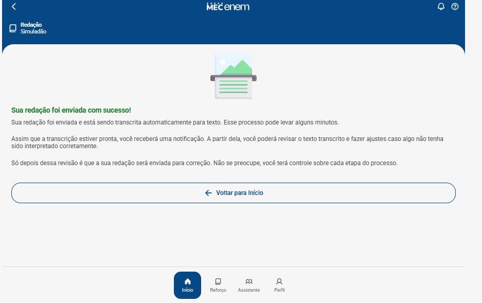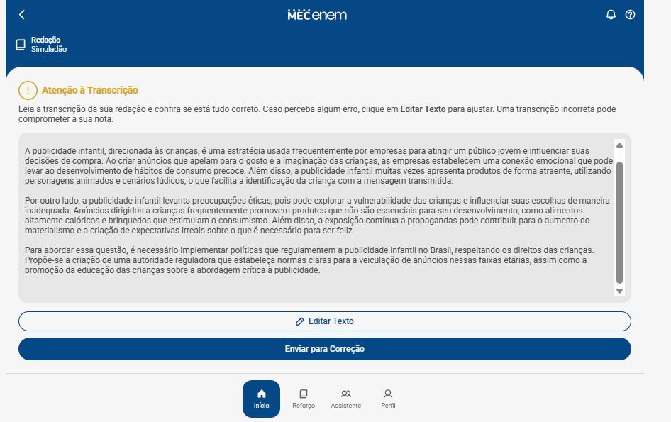Depois de revisar o texto transcrito, confirme a versão final no app e envie para a correção automática. A IA analisará a redação com base nos critérios do ENEM e emitirá uma avaliação.