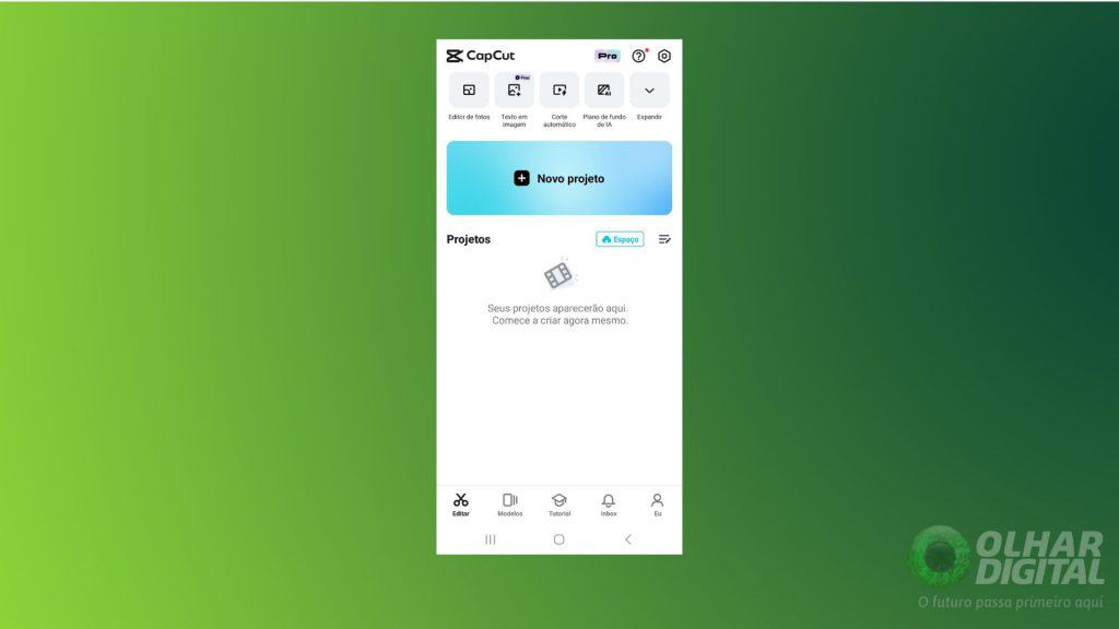 - Toque em ‘Novo Projeto’ para começar a editar o seu vídeo: