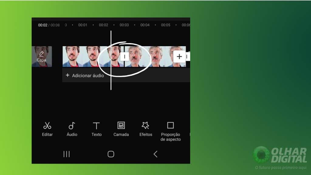 - Logo após, você deve tocar sobre o som inserido e arrastar para ajustar com as imagens. Para o cenário do som ter o tamanho maior que os seus frames, basta cortar as sobras de áudio na própria edição clicando sobre o arquivo e depois em dividir e excluir. Além disso, também é possível excluir o encerramento automático que o editor insere de forma automática no vídeo.