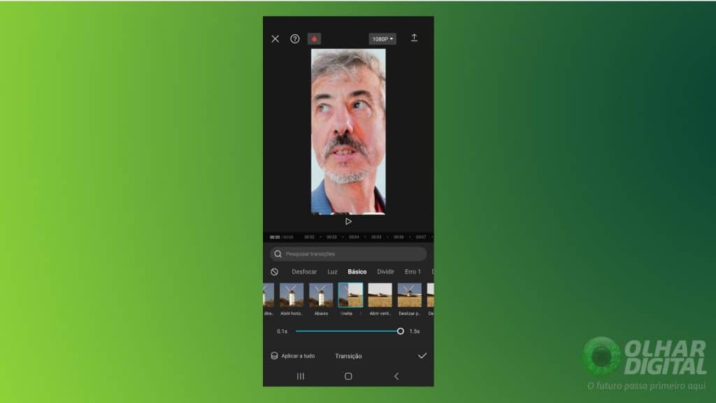 - Agora vá em básico, e selecione a transição‘ Deslizar para a direita’ e arraste a barra azul até ficar com 1.5 segundos e clique no símbolo de ok.