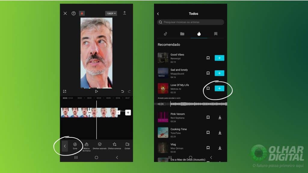 - Depois clique em áudio e logo após em ‘Sons’ para inserir uma trilha sonora ao seu gosto. No caso dessa edição, clicamos no símbolo de foguinho, que representa os áudios mais virais do TikTok, plataforma parceira e oficial do CapCut e depois selecionamos um som ao nosso gosto.