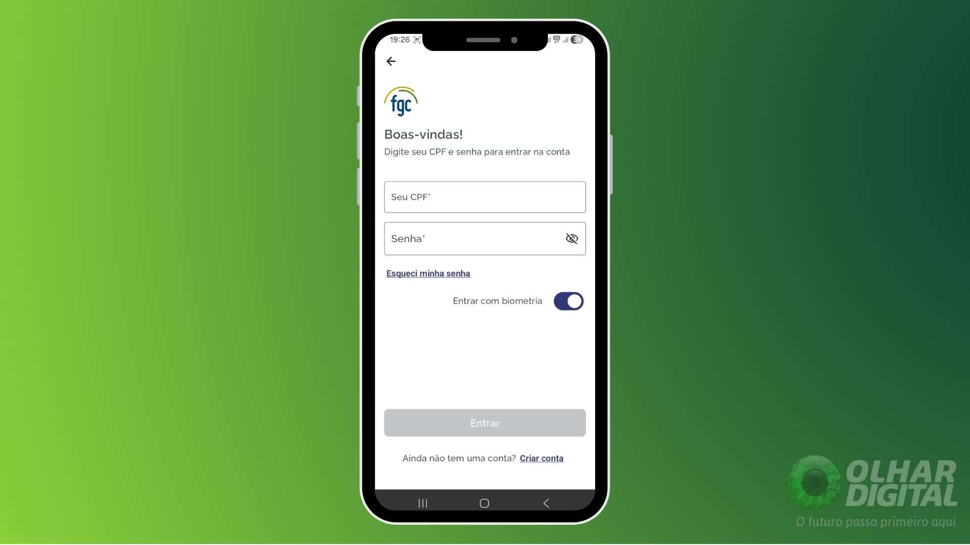 Abra o aplicativo oficial do FGC no seu celular e entre com seus dados de acesso.
