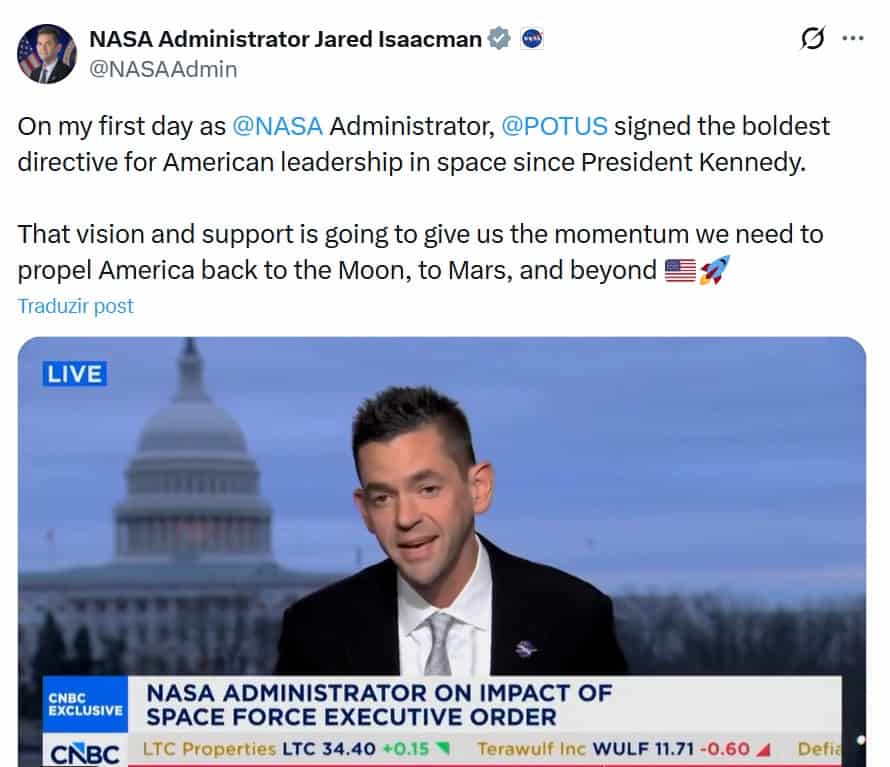Empreendedor e astronauta civil (ele comandou uma missão orbital da SpaceX em 2021), Isaacman assume a NASA em um momento de forte expansão de contratos com empresas privadas, incluindo SpaceX, Blue Origin e Boeing, que integram a campanha Artemis. O programa visa preparar o retorno humano à Lua e, mais adiante, apoiar a jornada rumo a Marte.