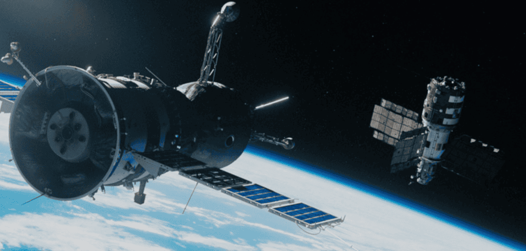 [ Soyuz T13 se aproximando da estação espacial Salyut 7 em rotação descontrolada – Créditos: Reprodução STV Film Company ]