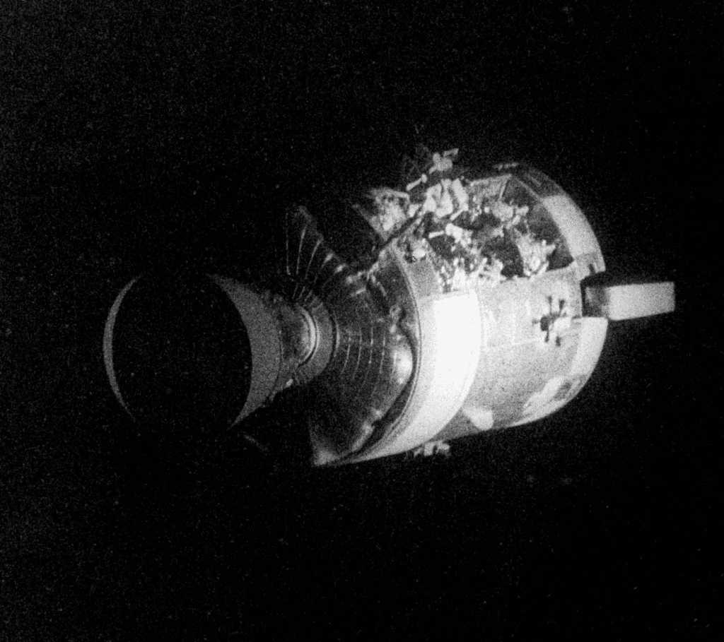 [ Danos no módulo de serviço da Apollo 13 fotografados após a separação, pouco antes do do retorno à Terra – Créditos: NASA ]