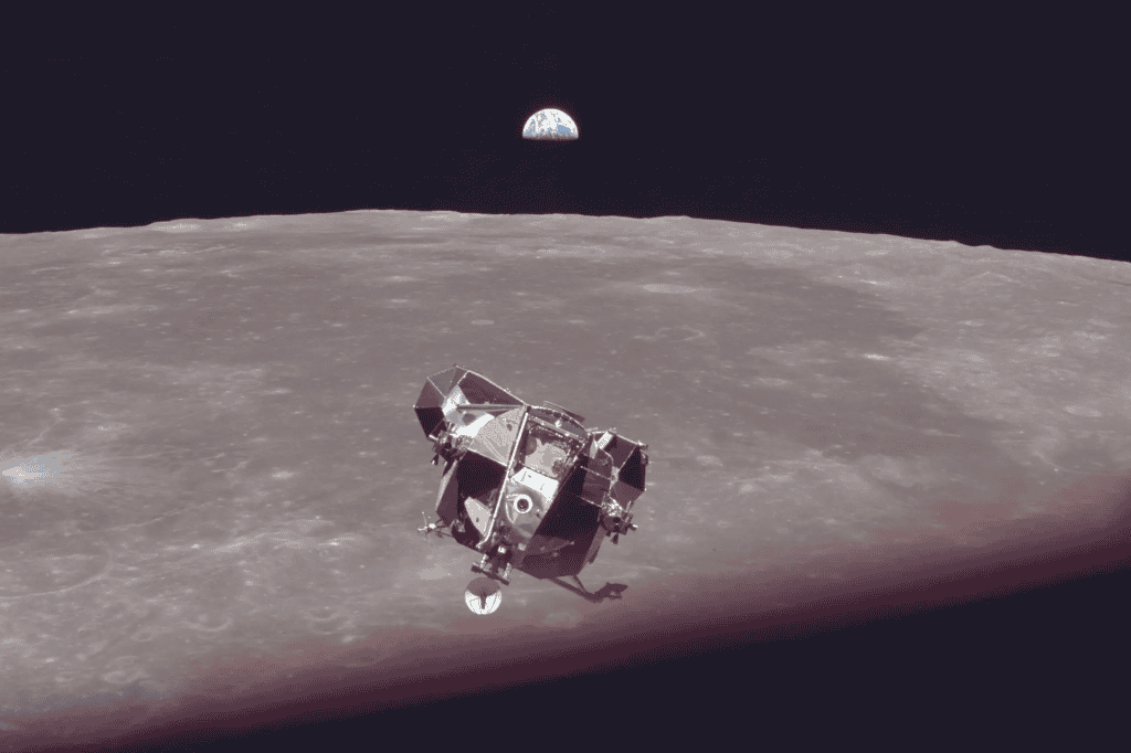 [ Módulo Lunar Eagle pouco depois de se separar do módulo de controle e iniciar a descida até o pouso histórico na Lua – Créditos: NASA ]