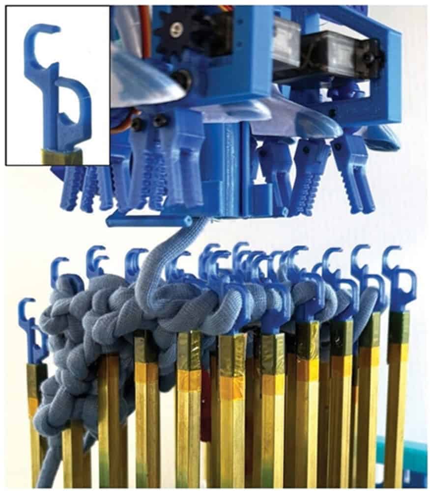 Cada uma dessas agulhas possui ganchos duplos simétricos, impressos em 3D e conectados a tubos de latão. Como as seções frontal e traseira se movem de forma independente, o dispositivo consegue alternar entre diferentes tipos de pontos, reproduzindo o comportamento do tricô manual.