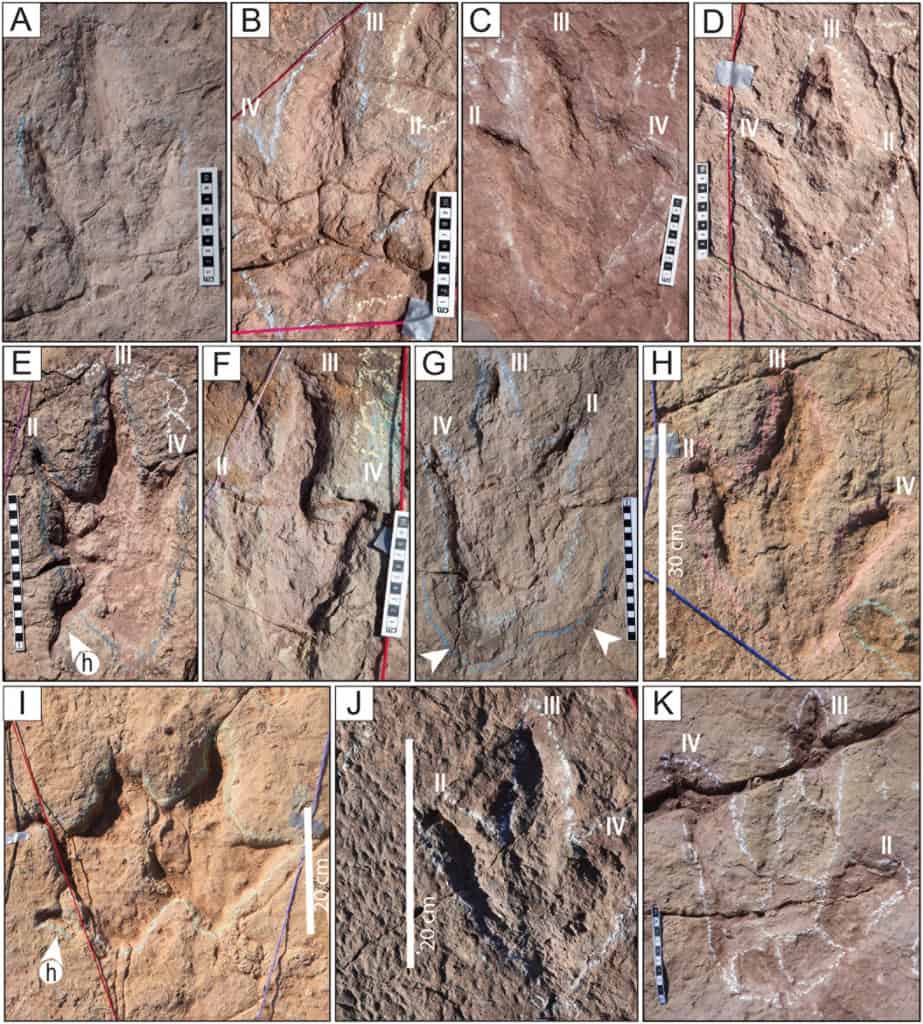 - As marcas variam de menos de dez centímetros a mais de 30 centímetros de comprimento, sugerindo a presença de diversas espécies durante a breve janela em que o sedimento permitiu a preservação;