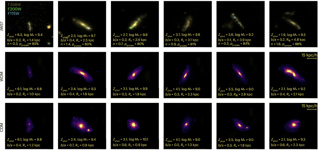 Além disso, a modelagem também indicou que partículas de “matéria escura quente” – como neutrinos estéreis, que se movem mais rapidamente – poderiam igualmente dar origem a galáxias filamentosas no Universo primordial. Em ambos os cenários, seja de matéria escura ondulatória ou quente, a chave reside na formação de filamentos mais suaves do que os previstos pela matéria escura fria. É ao longo desses filamentos mais sutis que o gás e as estrelas fluem lentamente, culminando na formação das galáxias alongadas que o JWST agora nos permite ver.