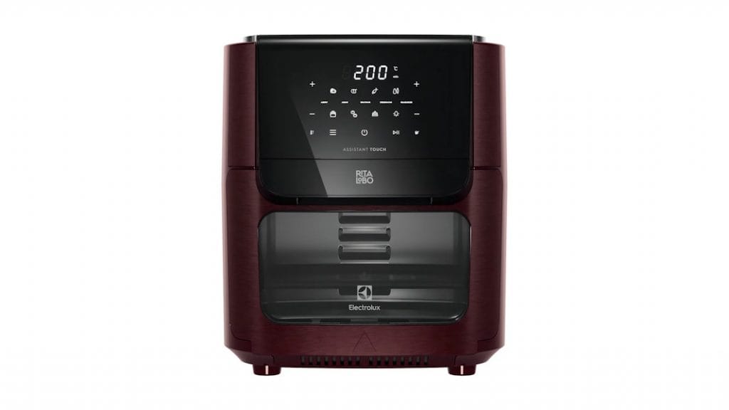 O modelo da Electrolux tem capacidade de 12 litros e potência de 1700 W, combinando funções de fritadeira e forno. O painel digital permite escolher modos predefinidos, regular temperatura e configurar o tempo. A estrutura interna comporta assados maiores e acessórios como bandejas e grelhas.