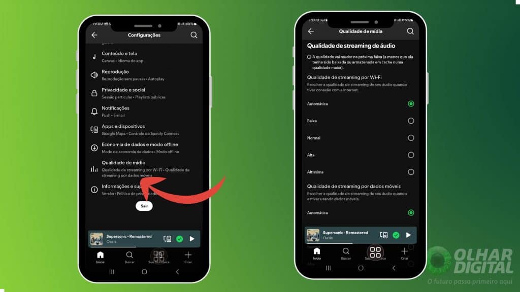 Na opção Qualidade de Mídia, o ideal é escolher Muito Alta tanto no Wi-Fi quanto nos dados móveis. Esses ajustes deixam a reprodução mais limpa e podem melhorar o volume geral.