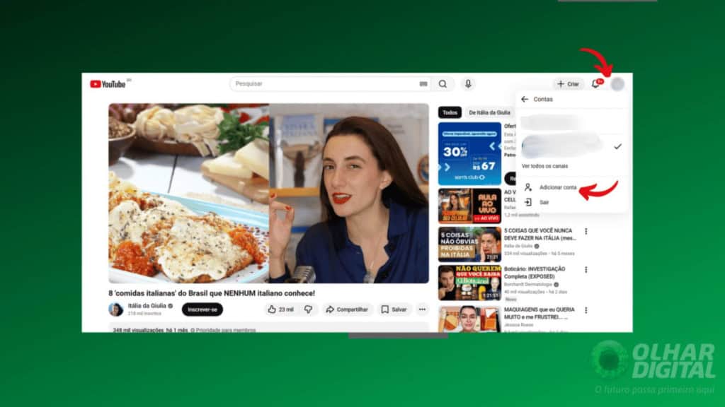 Crie um perfil totalmente separado usando a opção “Adicionar conta” (indicada pela seta). esta dica é a mais eficaz para evitar que um tipo de vídeo contamine o histórico e as recomendações do outro (Imagem: Captura de tela Reprodução: Renata Mendes / Olhar Digital)