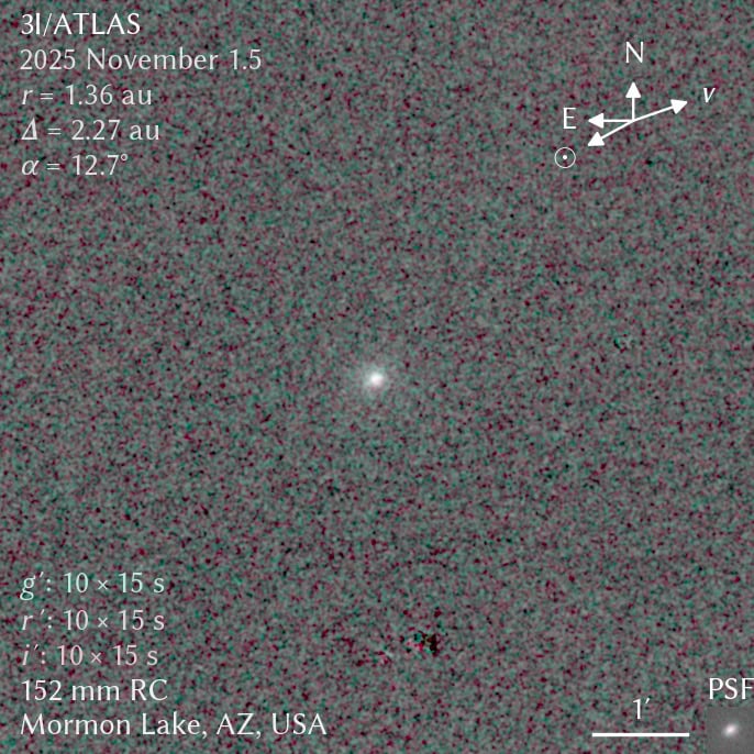 Imagem do cometa 3I/ATLAS em 1° de novembro de 2025, obtida com um telescópio de 152 mm. O cometa é o ponto predominantemente desfocado no centro, visível contra o fundo ruidoso do céu. Crédito: Qicheng Zhang/Observatório Lowell